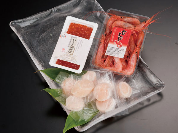 いくら醤油漬、甘エビ、天然ホタテの貝柱の3種類の海鮮具材をセットにしました。