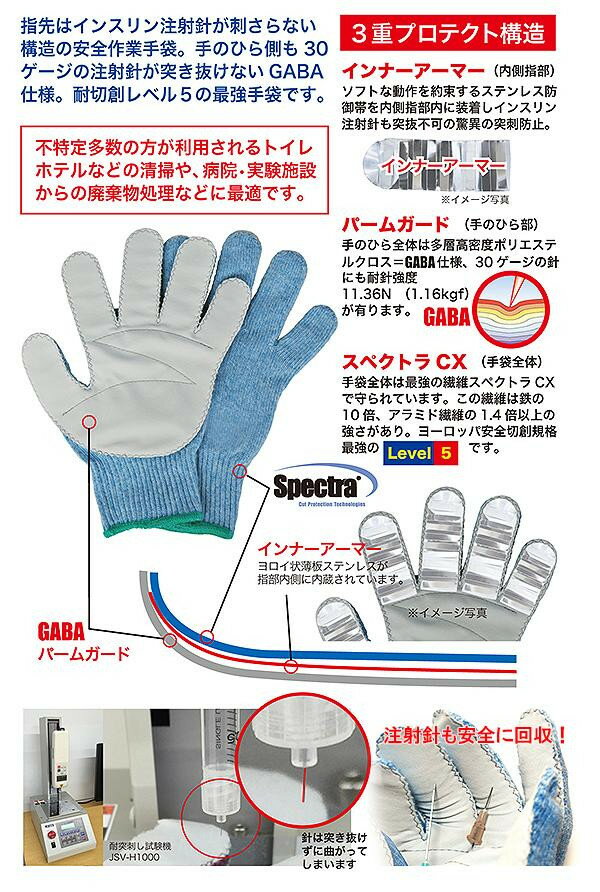 ※サプライヤー直送品 インスリン注射針が刺さらない安全作業手袋です。